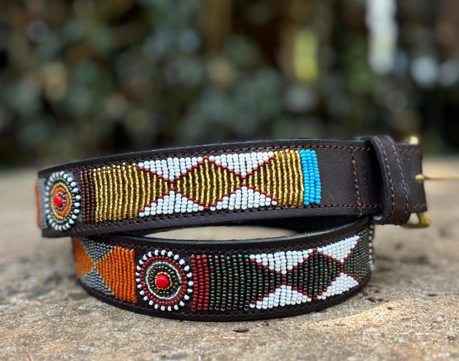 SCOTCHED EARTH: Handmade Maasai Beaded Leather Belt β African Tribal Artisan Belt for Men and Women β Boho Casual Ethnic Style
